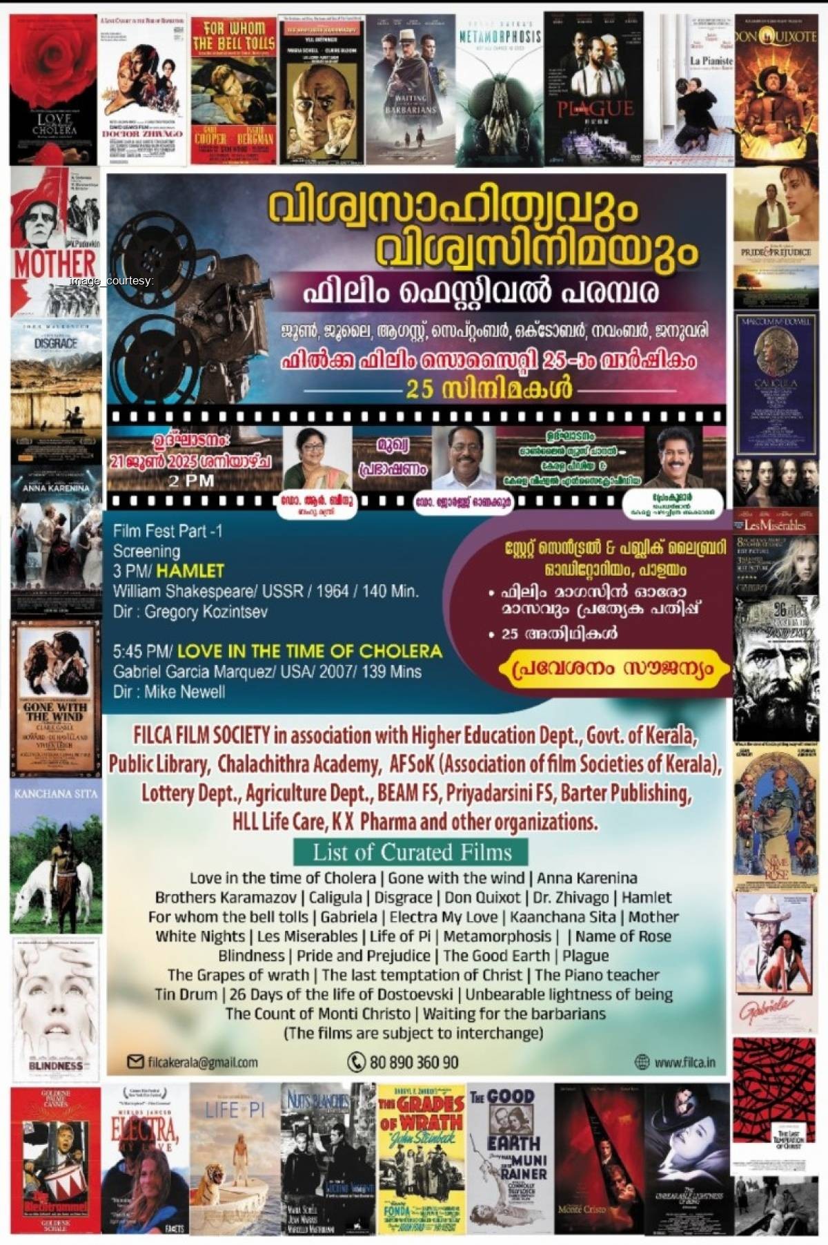 തിരു : 25 -)0 വാർഷികം പ്രമാണിച്ചു ഫിൽക്ക ഫിലിം സൊസൈറ്റി വിശ്വസാഹിത്യ കൃതികൾ ആസ്പദമാക്കിയുള്ള 25 സിനിമകൾ പ്രദർശിപ്പിക്കുന്നു . ജൂൺ 21 ശനിയാഴ്ച ഉച്ചയ്ക്ക് 2 മണിക്ക് പാളയം പബ്ലിക് ലൈബ്രറി ഓഡിറ്റോറിയത്തിൽ ഉന്നത വിദ്യാഭ്യാസ വകുപ്പ് മന്ത്രി ഡോ. ആർ .ബിന്ദു ചലച്ചിത്രമേള ഉദ്ഘാടനം ചെയ്യും . ചലച്ചിത്ര സാഹിത്യവും ഗ്രന്ഥസൂചിയും എന്ന ലഘു വിജ്ഞാനകോശം പ്രകാശിപ്പിക്കും . മുഖ്യപ്രഭാഷകൻ ഡോ . ജോർജ്ജ് ഓണക്കൂർ . ഫിൽക്കയുടെ ന്യൂസ് പോർട്ടലായ കേരളപീഡിയയുടെയും കേരള വിഷ്വൽ എൻസൈക്ലോപീഡിയായുടെയും ഉദ്ഘാടനം ചലച്ചിത്ര അക്കാദമി ചെയർമാൻ പ്രേംകുമാർ നിർവഹിക്കും . ഉന്നത വിദ്യാഭ്യാസ വകുപ്പ് , പബ്ലിക്ക് ലൈബ്രറി , ചലച്ചിത്ര അക്കാദമി , ബീം ഫിലിം സൊസൈറ്റി , പ്രിയദർശിനി ഫിലിം സൊസൈറ്റി , തലസ്ഥാന പൗരസമിതി , അസോസിയേഷൻ ഓഫ് ഫിലിം സൊസൈറ്റീസ് ഓഫ് കേരള, ബാർട്ടർ പബ്ലിഷിംഗ് തുടങ്ങിയവർകൂടി ചേർന്നാണ് ചലച്ചിത്രമേള സംഘടിപ്പിക്കുന്നത് . 3 മണിക്ക് ഗ്രിഗറി കൊസിന്റ് സേവ് സംവിധാനം ചെയ്ത ഷേക്സ്പീയർ നാടകത്തിന്റെ ചലച്ചിത്രരൂപം ഹാംലറ്റ് പ്രദർശിപ്പിക്കും . തുടർന്ന് 5:45 ന് ഗബ്രിയേൽ ഗാർഷ്യ മാർക്വിസിന്റെ നോവലിന്റെ ചലച്ചിത്രരൂപം ലൗ ഇൻ ദി ടൈം ഓഫ് കോളറ . കൂടുതൽ വിവരങ്ങൾക്ക് www.filca.in . പ്രവേശനം സൗജന്യം . ഫോൺ 8089036090 / 9847063190 / 9633670050.